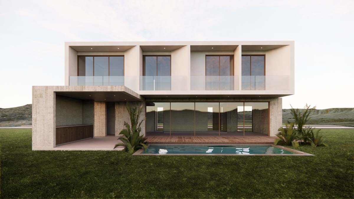 - Descripción: El proyecto contempla una vivienda unifamiliar de 03 pisos. El volumen arquitectónico ha sido diseñado contemplando las restricciones del reglamento interno del condominio como los retiros laterales. Así mismo, el proyecto se genera mediante la búsqueda de conexiones visuales desde el interior de la casa hacia el paisajismo propuesto en el lote.
