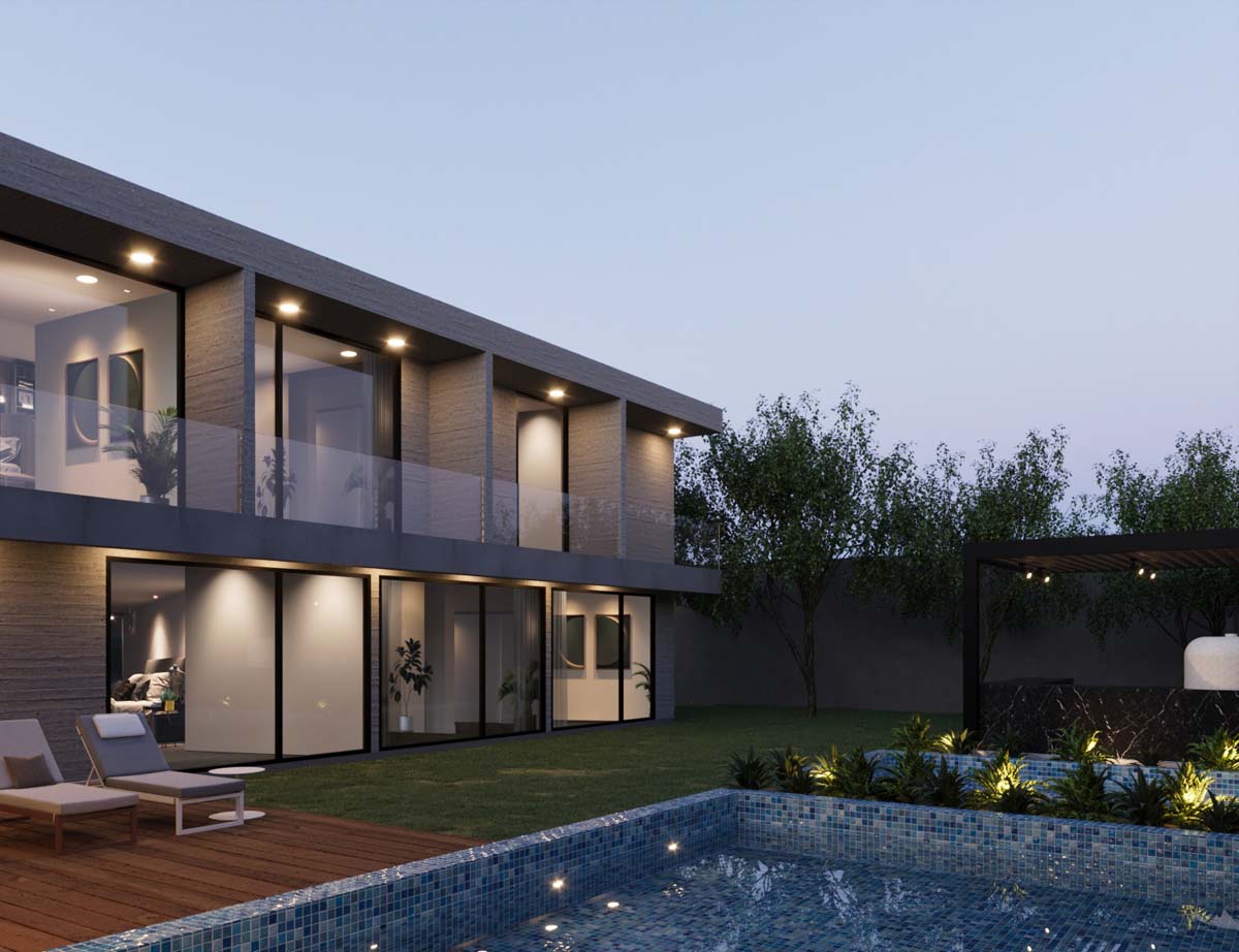 - Descripción: El proyecto comprende una vivienda unifamiliar de un sótano y dos pisos. El volumen arquitectónico ha sido meticulosamente diseñado considerando las restricciones del Reglamento Nacional de Edificaciones y del certificado de parámetros, como los retiros laterales, frontales y posteriores. Además, el proyecto busca establecer una conexión visual entre el área social y área libre, optimizando el espacio después de definir los ambientes propuestos para los propietarios. Así, se logra un bloque compacto que favorece la interrelación exterior-interior.